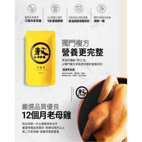 • 內容量:7入/盒 - 42ml x7,14入/盒 - 42ml x14 • 每盒(連包裝)重量:7入/盒約550g,14入/盒約950g • 保存期限: 18個月 • 產地: 台灣 😋 成份:老母雞、豬肉 😋 老協珍以傳承八十年的熬工法,讓傳統滴雞精營養成分完全釋放,精粹上等老母雞深層精華 😋 獨創「熬工法」,使用「水合」工法將小分子(胜肽、胺基酸等)營養帶出雞肉,「熬煮」工法則是利用高溫提升水分子的驅動力,來加速大分子(蛋白質)營養更完整溶於雞精中 😋 以獨門複方萃取更完整營養,採用12個月以上第二代老母雞加上少許豬腩排,萃取出口感更醇厚的美味 😋 以天然複方慢工細熬,並經SGS檢驗合格 😋 注意事項:痛風、高血壓及腎臟病患者飲用前請先諮詢醫師 圖片來源:官方網頁